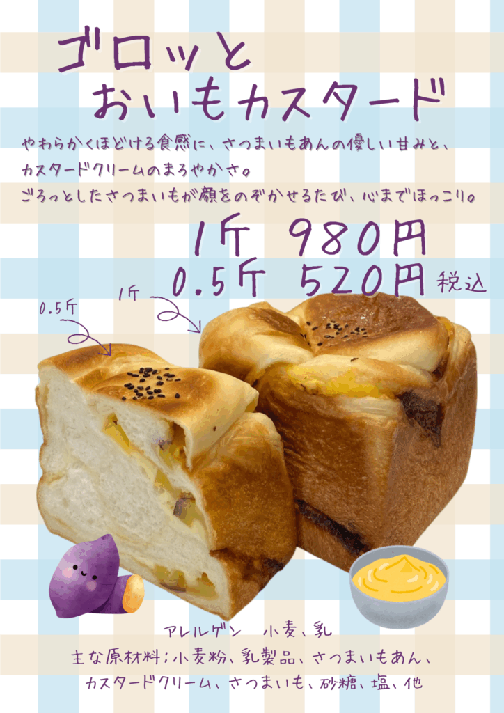 2025.11.19 お知らせ 11月の新商品『ゴロッとおいもカスタード』 栗山町の長尾農場さんのほくほくで甘い『由栗いも』をゴロッと使用しています。 スイートポテトをイメージした自信作です。 是非ご賞味ください!